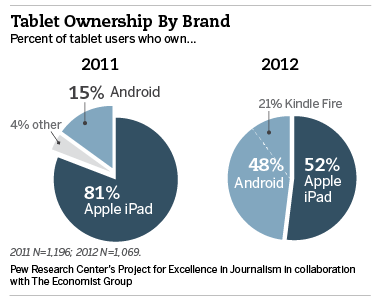 Колкото до останалите производители, 21 процента имат Kindle Fire, а Samsung, HTC и други заемат около 8 процента пазарен дял. Анкетата, обаче, е проведена преди представянето на Google Nexus 7 и Kindle Fire HD на Amazon.