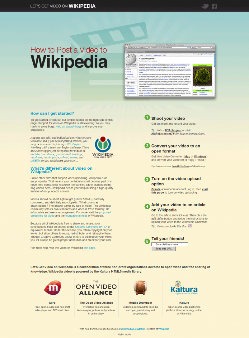 Ако все още не знаете, вижте как се публикува видео в Wikipedia от уебсайта на инициативата. Информацията е достъпна и разбираема за всеки грамотен интернет потребител. Споделени са и линкове към конвертори до видеоформата, който се използва от енциклопедията – Theora.