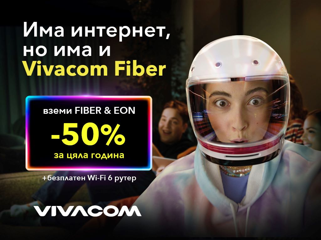 Vivacom предлага ексклузивна оферта за високоскоростен интернет Vivacom Fiber и EON телевизия с 50% отстъпка за цяла година. В допълнение всички клиенти, които се възползват от промоционалната оферта, получават напълно безплатно най-новото поколение рутер – Wi-Fi 6, който осигурява по-бърза скорост, по-висока производителност и по-стабилна работа.