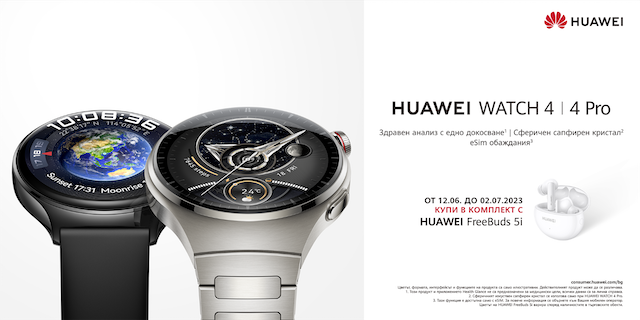 Вече може да намерите най-новите елегантни смарт часовници HUAWEI WATCH 4 и HUAWEI WATCH 4 PRO във всички магазини на Vivacom или онлайн на специални цени от 21,98 лева на месец на лизинг за 36 месеца със сключване на 24-месечен договор с план Unlimited 300 за смарт часовник HUAWEI WATCH 4 в комплект със слушалки Freebuds 5i до 2 юли. А смарт часовник HUAWEI WATCH 4 PRO в комплект със слушалки Freebuds 5i отново до 2 юли, може да бъде закупен на цена от 28,98 лева на месец на лизинг за 36 месеца със сключване на 24-месечен договор за план Unlimited 300.