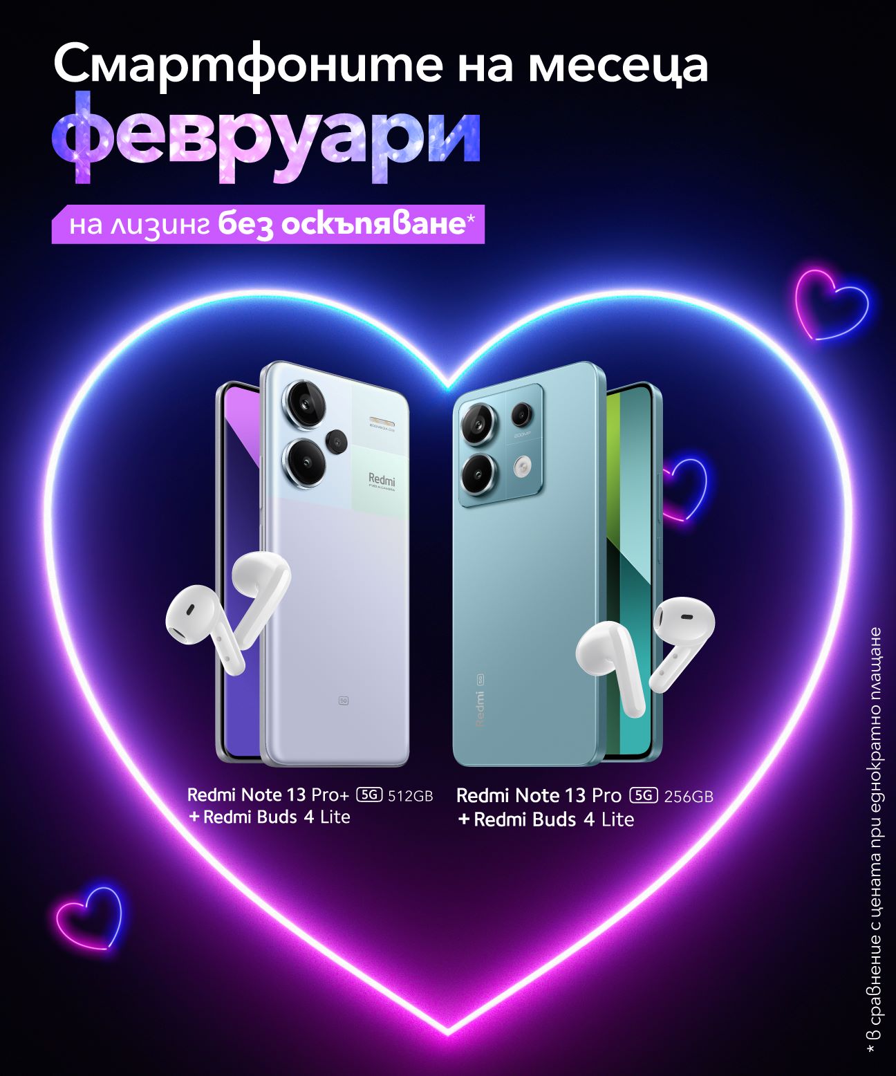 През целия февруари Vivacom ще зарадва всички почитатели на марката Xiaomi с две свежи и актуални предложения от чисто новата Redmi Note 13 серия – Redmi Note 13 Pro 5G и Redmi Note 13 Pro+ 5G. Двата отлични 5G смартфона могат да бъдат закупени съответно за 18,75 лв./месец и 27,08 лв./месец на изплащане без оскъпяване до края на февруари за 24 месеца с план Unlimited 300. Устройствата на месеца във Vivacom идват в комплект с елегантните безжични слушалки Redmi Buds 4 Lite.