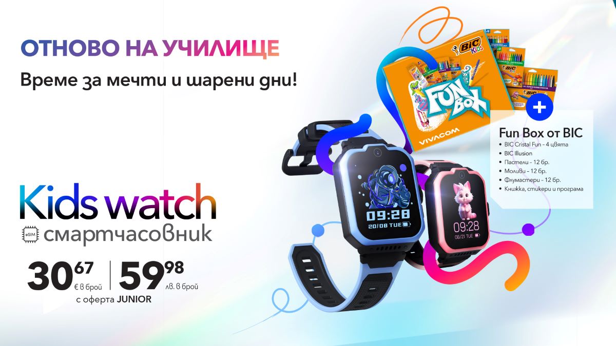 С наближаването на новата учебна година Vivacom стартира специална Back to School кампания. При покупка на детския смарт часовник Vivacom Kids Watch, родителите и техните деца ще получат за първия учебен ден в комплект и FUN BOX. Кутията включва висококачествени материали BIC – пастели, моливи, флумастери, книжка за оцветяване, стикери и програма.