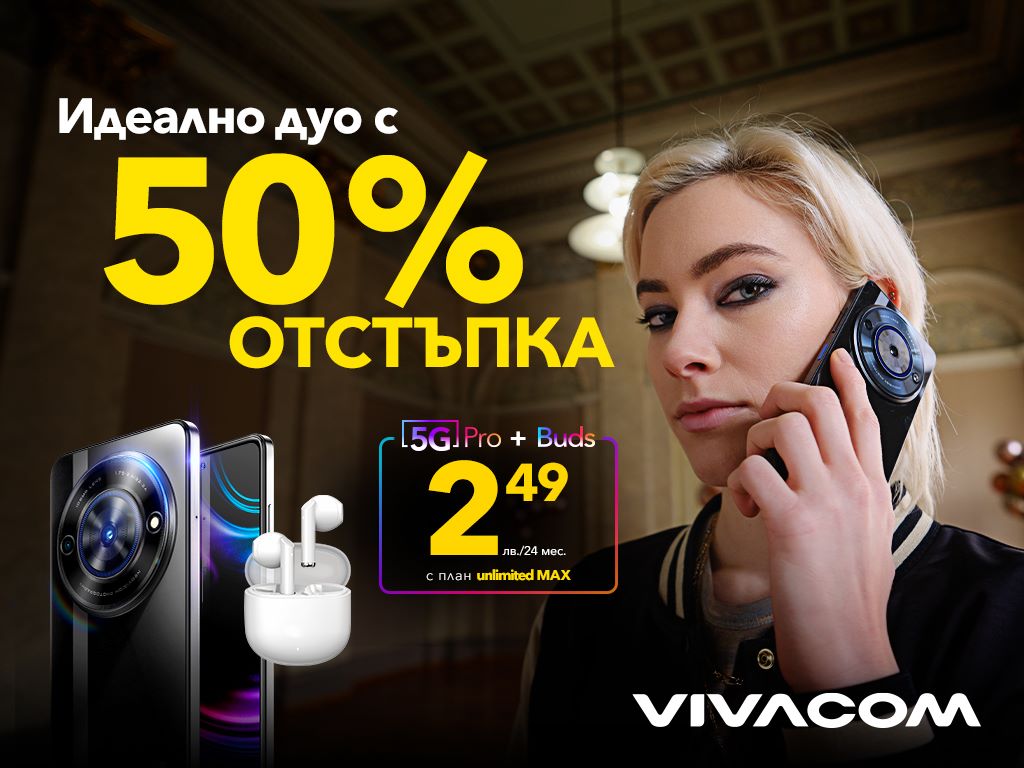 В допълнение към неограничените мегабайти на максимална скорост, Vivacom предлага и ексклузивна оферта с 50% отстъпка за впечатляващия смартфон Vivacom 5G Pro в комплект с безжичните слушалки Vivacom Buds. Идеалното дуо е на цена от само 2.49 лева на месец на лизинг за 24 месеца в комбинация с 24-месечен договор за план Unlimited MAX.