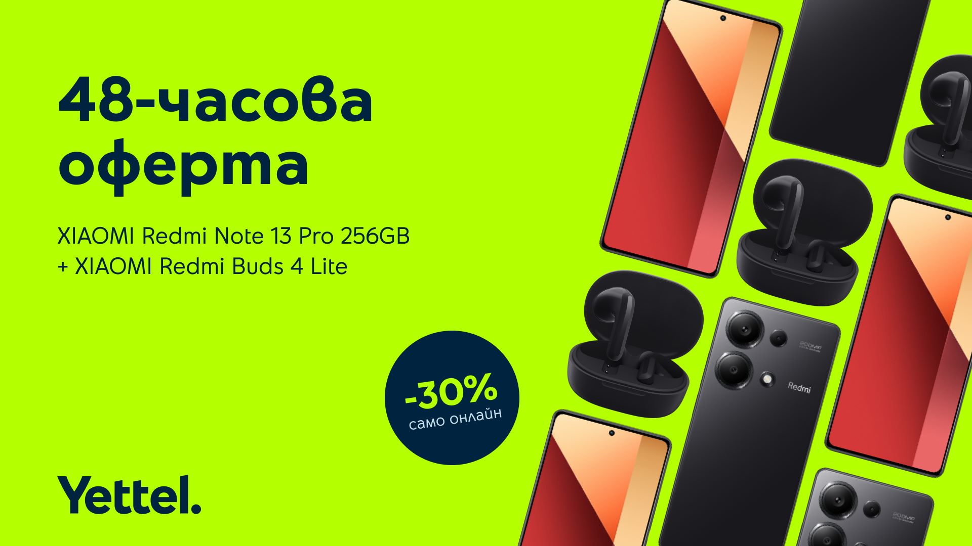 И тази седмица Yettel има лимитирана оферта в своя онлайн магазин – смартфонът Xiaomi Redmi Note 13 Pro 256GB се предлага с 30% отстъпка до 12:00 часа на 22 май при плащане в брой и в комбинация с подписването на двугодишен договор за мобилен план.
