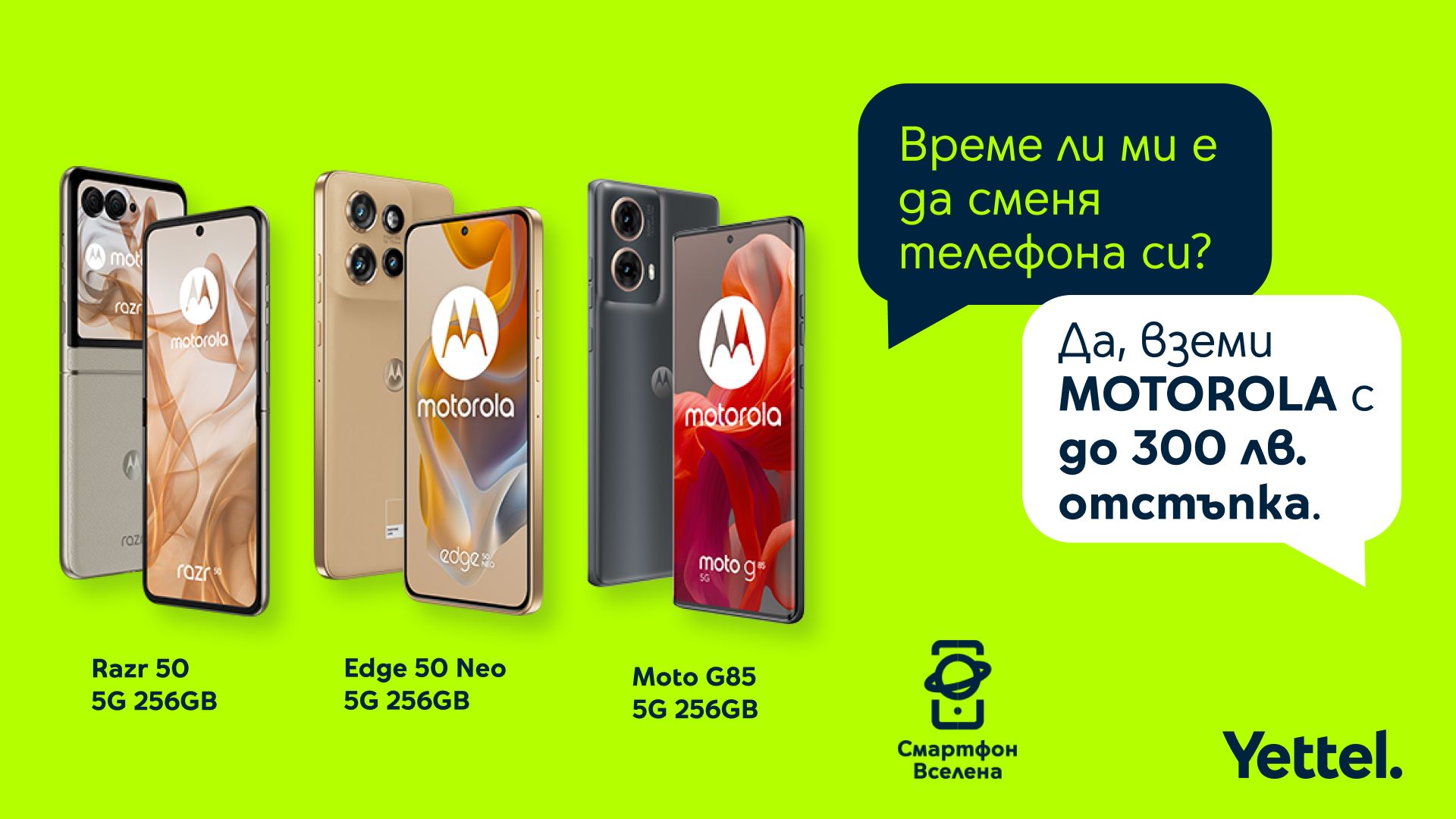 Този месец Yettel предлага избрани модели смартфони от Motorola с отстъпки до 300 лева. Офертата включва някои от най-популярните модели от сериите Moto, Edge и Razr, които предлагат 5G свързаност, усъвършенствани камери и отлична енергийна ефективност. С това специално предложение Yettel предоставя на своите клиенти идеалната възможност да обновят своите устройства с едни от най-добрите смартфони на пазара на по-достъпни цени.