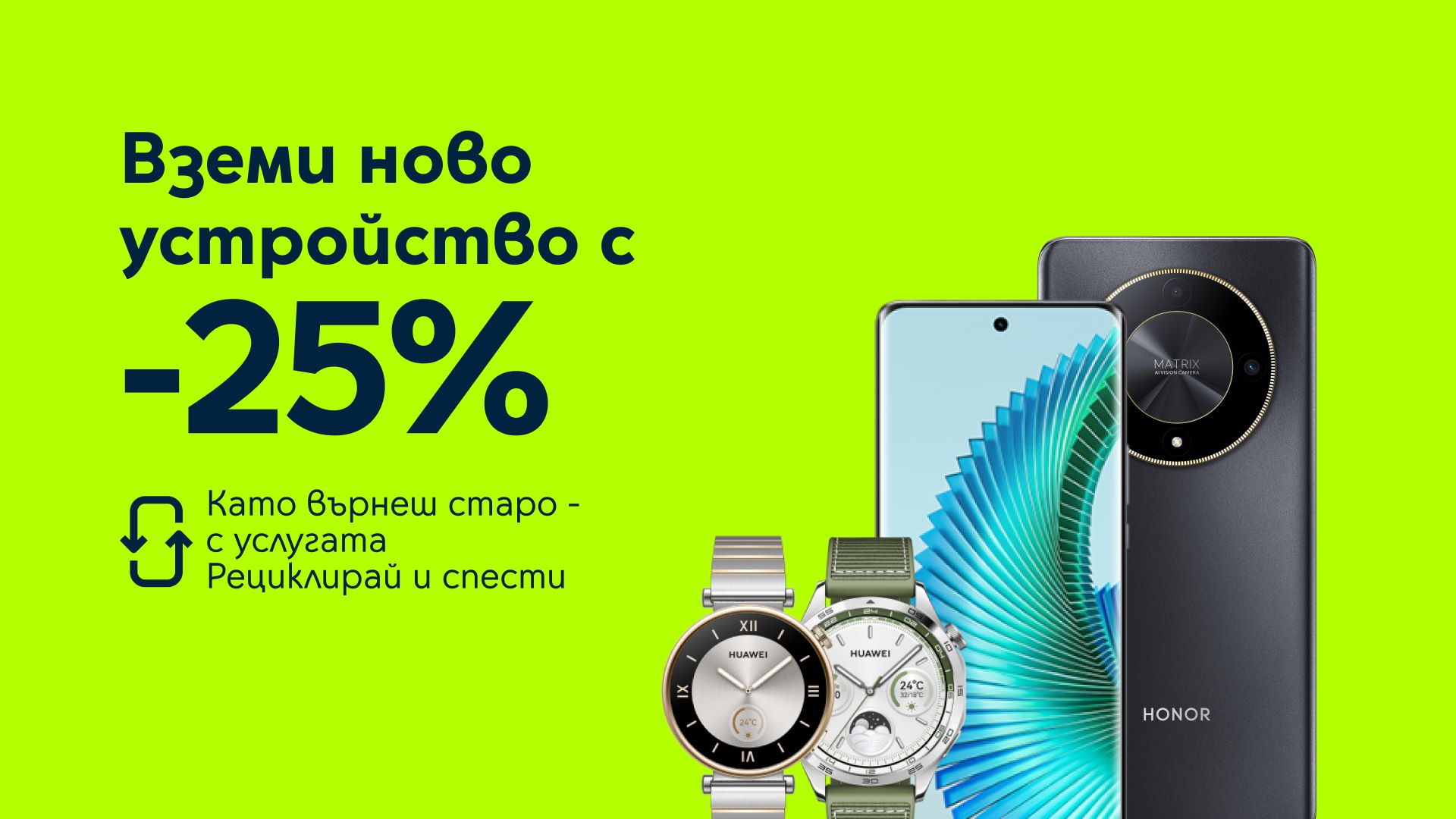25% намаление от крайната цена, ако бъде върнат за рециклиране стар смартфон, таблет или смарт часовник, без значение дали е работещ, или не, осигурява Yettel чрез своята инициатива „Рециклирай и спести“. Включените в промоционалната кампания през март устройства са HONOR Magic6 Lite 5G 256GB, Samsung Galaxy A14 5G 128GB, HUAWEI WATCH GT 4 46mm Green и HUAWEI WATCH GT4 41mm Silver. Клиентите могат да се възползват от четирите изгодни оферти при сключване на нов Total Unlimited договор в цялата търговска мрежа, както и онлайн. При пазаруване от сайта на Yettel отстъпката се получава с добавяне на промокода “RECYCLE25” за поръчки в брой. Старото устройство се връща в магазина на оператора или при доставката на новото, директно на куриера. Така потребителите допринасят за намаляване на електронните отпадъци в природата и същевременно се възползват от намаление за нов апарат.