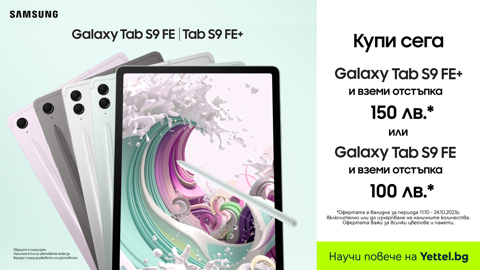 Стартовата цена на новия SAMSUNG Tab S9 FE 5G 128GB е намалена със 100 лв. и до 24 октомври ще бъде 774,99 лв. в брой с пакет Интернет Max 36.99 и договор за 24 месеца или на лизинг за 37,59 лв. на месец за 24 месеца. До 24 октомври пък SAMSUNG Tab S9 FE+ 5G 128GB може да бъде взет със отстъпка от 150 лв. за 984,99 лв. в брой с пакет Интернет Max 36.99 и договор за 24 месеца или на лизинг за 47,59 лв. на месец за 24 месеца.