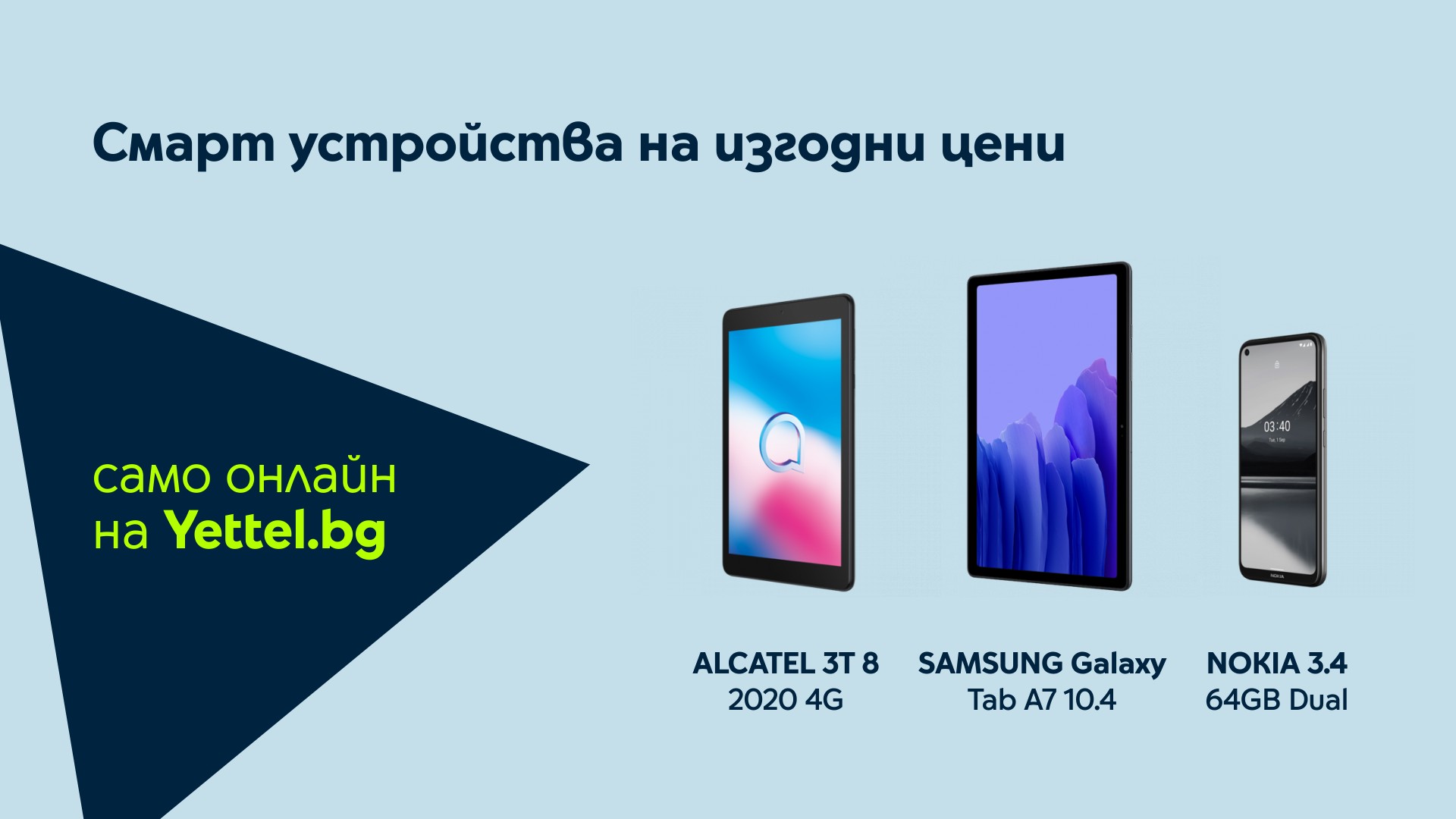 Портфолиото от изгодни устройства се допълва всеки месец, а сред най-новите предложения през юни са три изгодни таблета на Alcatel и Samsung. Със своята ниска цена и характеристики, все още незагубили своята актуалност, моделите са подходящи за широк кръг бъдещи и настоящи клиенти на Yettel.