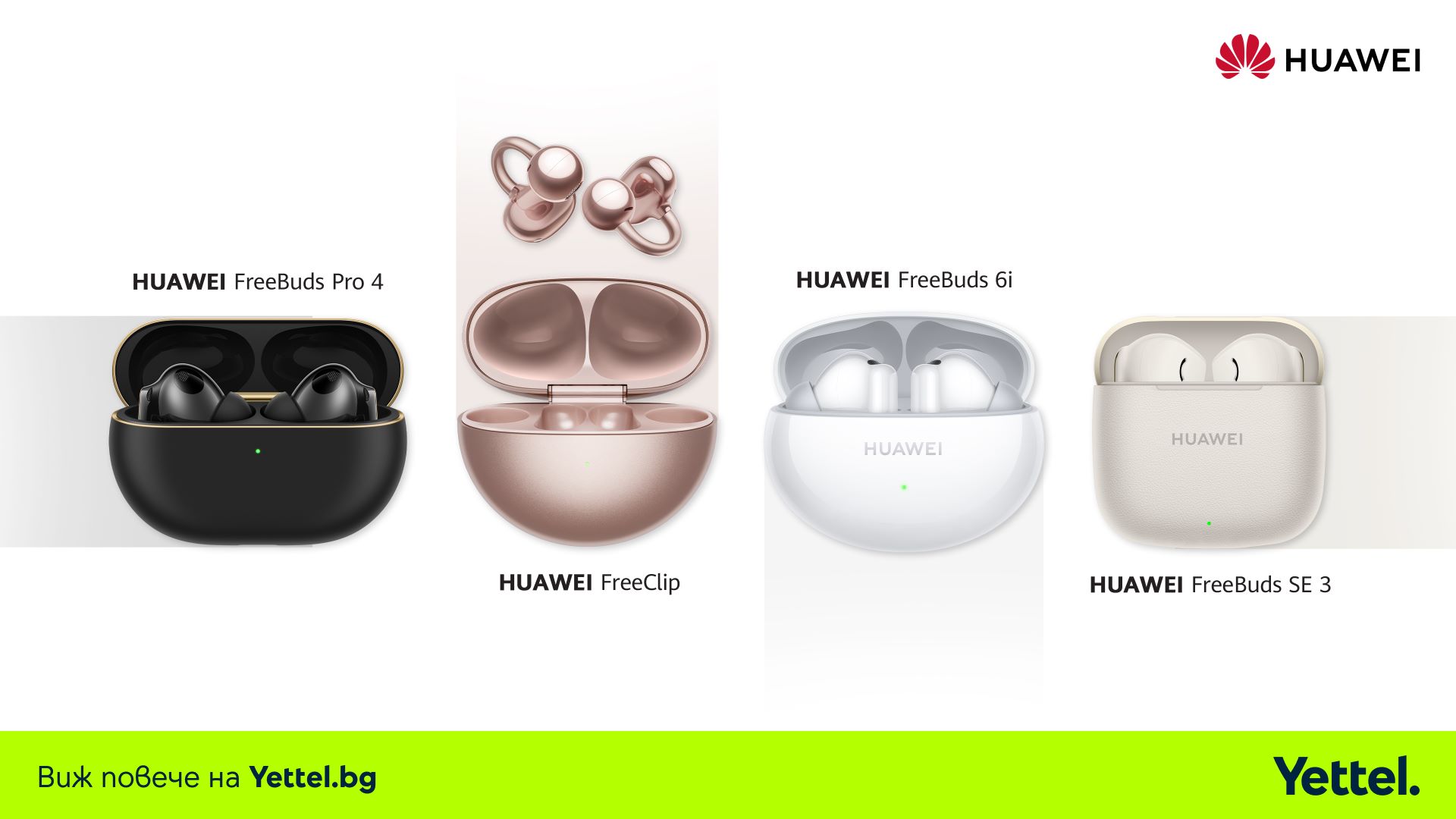 В магазините и на сайта на Yettel вече можете да откриете още по-голямо разнообразие от слушалки на HUAWEI. Сред новите попълнения са впечатляващите HUAWEI FreeBuds Pro 4, които се предлагат в три стилни цвята – Black, Ceramic White и Green. Те представляват идеалното съчетание от иновации и стил, осигурявайки перфектен баланс между кристален звук и удобство за ежедневна употреба. Всеки клиент, закупил модела, ще получи 50% сервизна отстъпка при поръчка на загубена слушалка, като този гаранционен период важи за 12 месеца, считано от датата на закупуване, а намалението e достъпно през оторизирания сервизен център на HUAWEI.