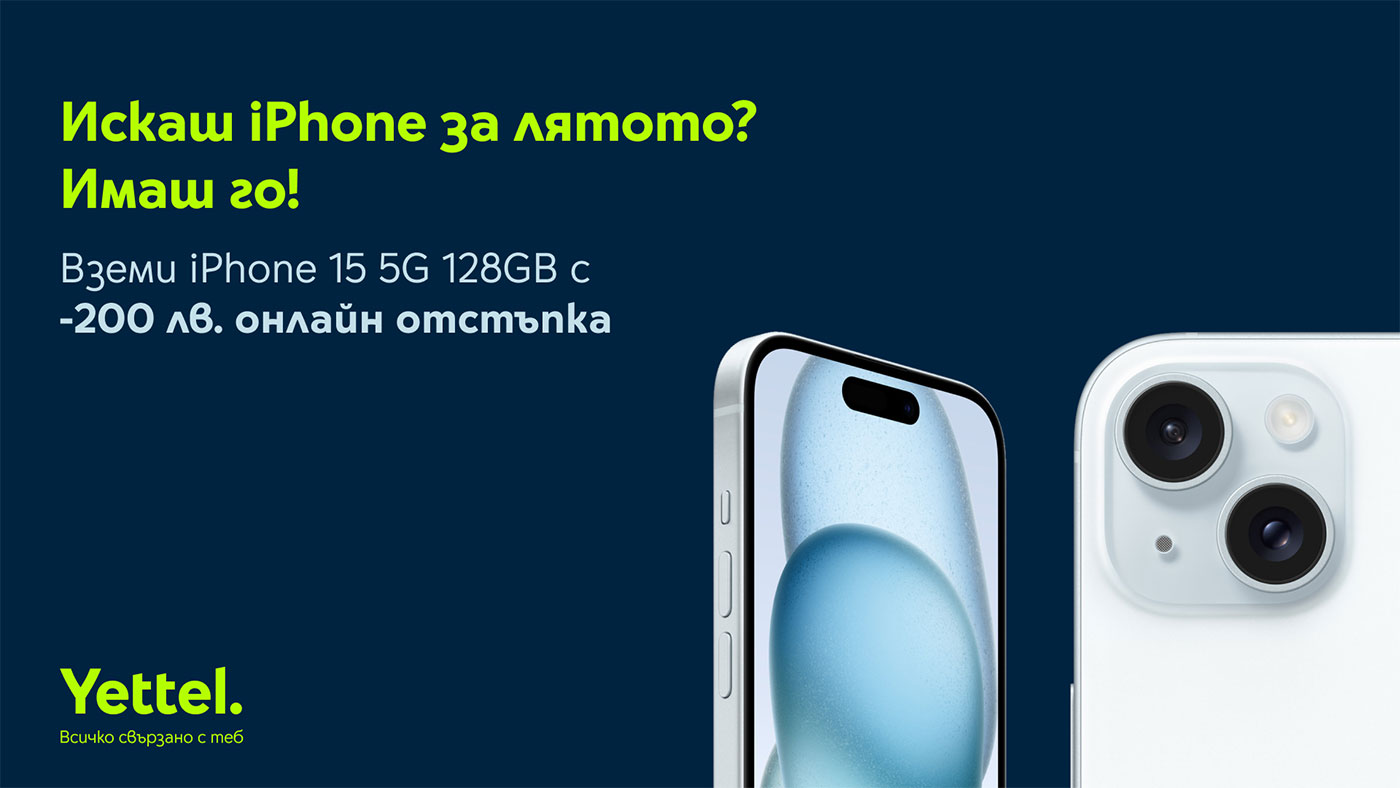 До края на юли в онлайн магазина на Yettel iPhone 15 128 GB може да бъде закупен на промоционални условия. Смартфонът се предлага с отстъпка от 200 лв. при подписване на двугодишен договор с всички планове Total и Total Unlimited. Цената му е 839,99 лв. в брой вместо стандартните 1039,99 лв., или на лизинг за 39,99 лв. на месец с план Total Unlimited MAX за 24 месеца. Клиентите могат да се възползват от офертата само онлайн, като тя е валидна до 31 юли 2025 г. или до изчерпване на наличностите.
