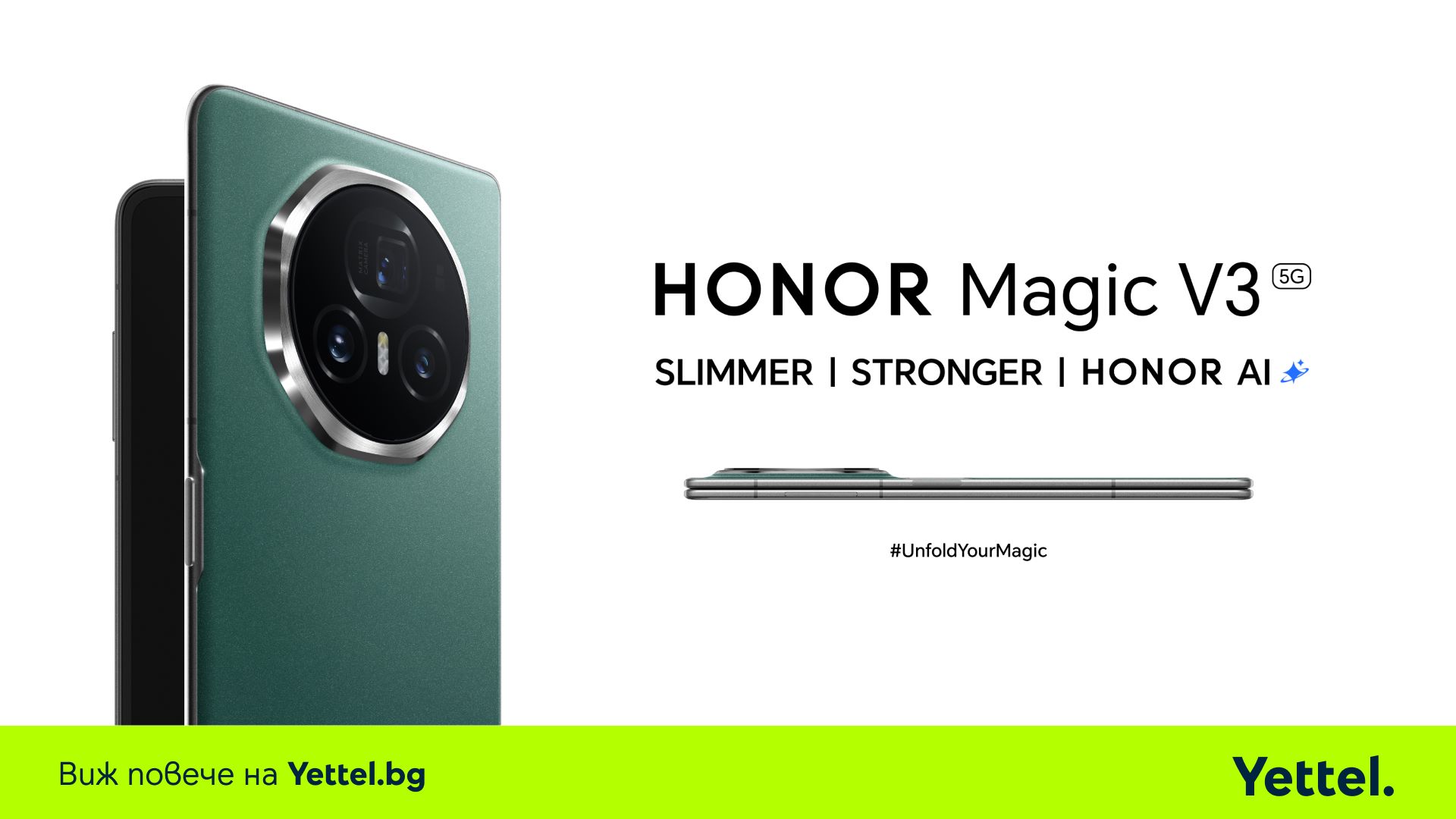HONOR Magic V3 може да бъде поръчан сега на промоционална цена от 1929,99 лева в брой или на лизинг за 94,59 лева на месец с двугодишен абонамент за план Total Unlimited 59.99 от Yettel.