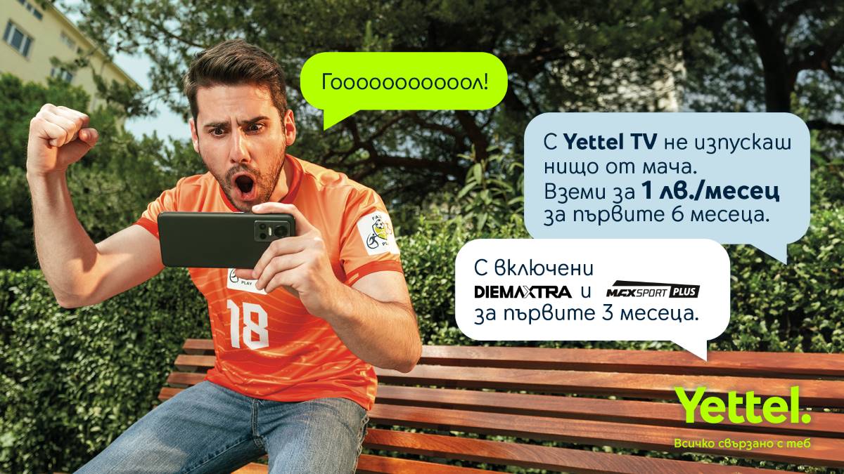 С наближаването на Европейското първенство по футбол Yettel TV осигурява страхотна възможност за всички любители на футбола. До края на юли Yettel предлага интерактивна телевизия за 1 лев на месец за първите шест месеца с включени спортните канали на MAX Sport и DIEMA XTRA за 3 месеца, при сключване на двугодишен абонамент. Клиентите на оператора могат да закупят и телевизор на лизинг, като през първите три месеца няма да се дължат лизингови вноски.